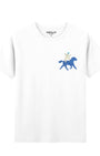 This unisex white T-shirt stands out with an original, playful embroidery depicting a rider on a blue horse. The motif is placed on the chest for a bold artistic touch and a pop of color. It is made from a comfortable blend of 80 % cotton and 20% polyester, offering an excellent balance of lasting comfort and durability.