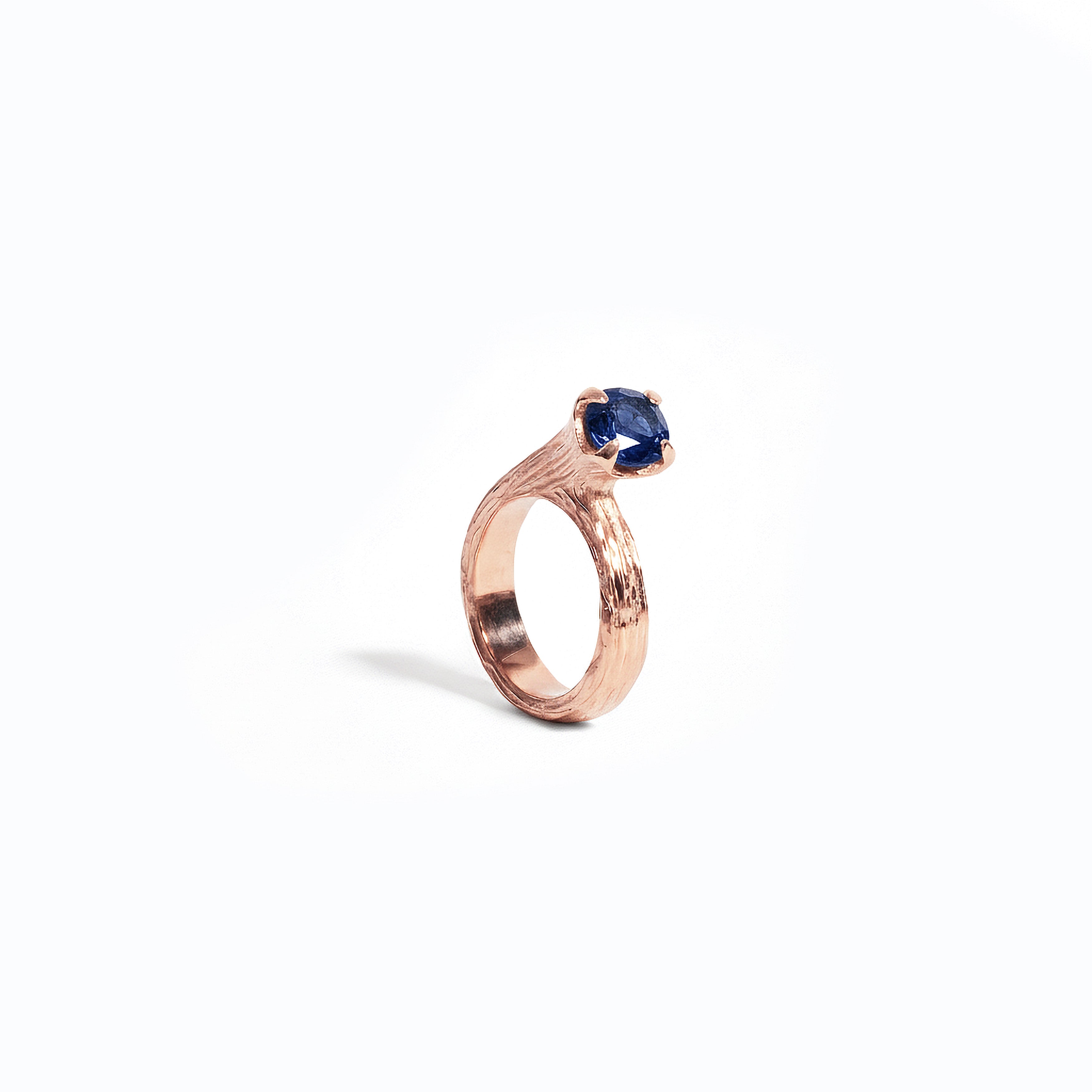 Set with a 1.5 carat sapphire, it stands out for its unique character.