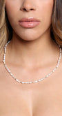 Una cautivadora combinación de textura orgánica y colores vibrantes, este collar presenta brillantes perlas de agua dulce intercaladas con detalles de esmeralda natural. La pieza se realza con un distintivo cierre de plata adornado con un dije protector de "Ojo Maligno", que fusiona la elegancia atemporal con un toque simbólico. Una pieza refinada y directa, diseñada para un uso diario informal o para combinar con sofisticadas capas.