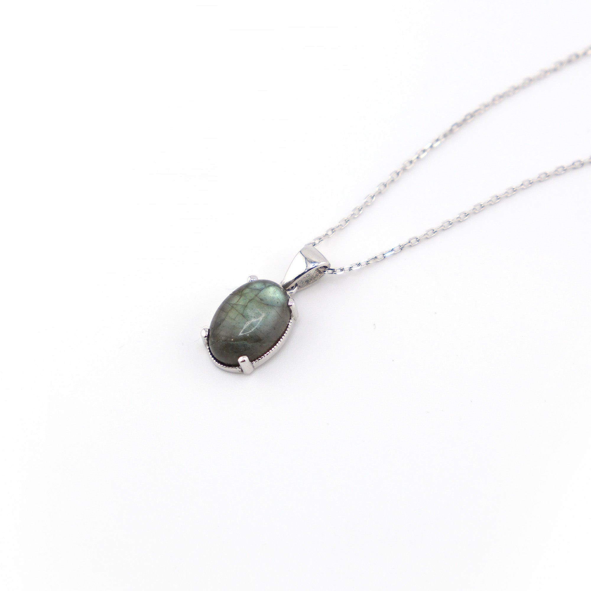 La monture du pendentif est en argent sterling 925 et la pierre précieuse est une labradorite de 8 carats. Chaîne en argent sterling 925 incluse avec l'achat.