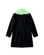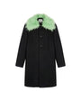 Ce manteau noir saisissant se distingue par son col en fausse fourrure vert menthe éclatant et sa silhouette nette et minimaliste. Il présente un devant boutonné simple et une coupe épurée qui crée un look moderne et architectural.