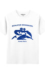 T-shirt unisexe blanc se distingue par un imprimé graphique et audacieux en bleu cobalt, représentant une composition artistique de figures humaines dans un style abstrait ou moderne, surmontée du message accrocheur "BONJOUR MONSIEURS". Il est confectionné dans un mélange agréable de 80 % coton et 20 % polyester, offrant un excellent équilibre entre confort optimal et résistance au temps.