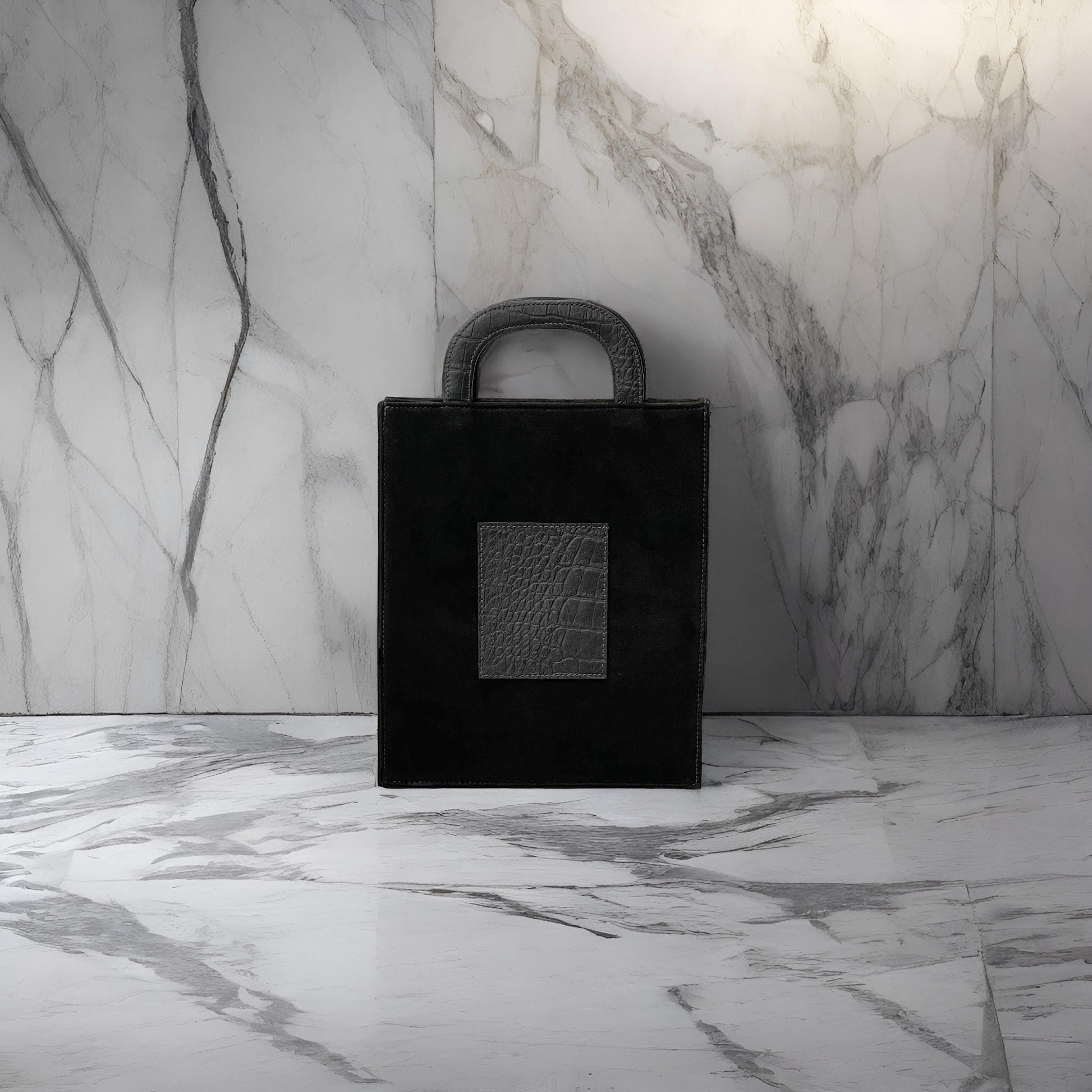 Les matériaux incluent le cuir suédé et le cuir embossé crocodile.