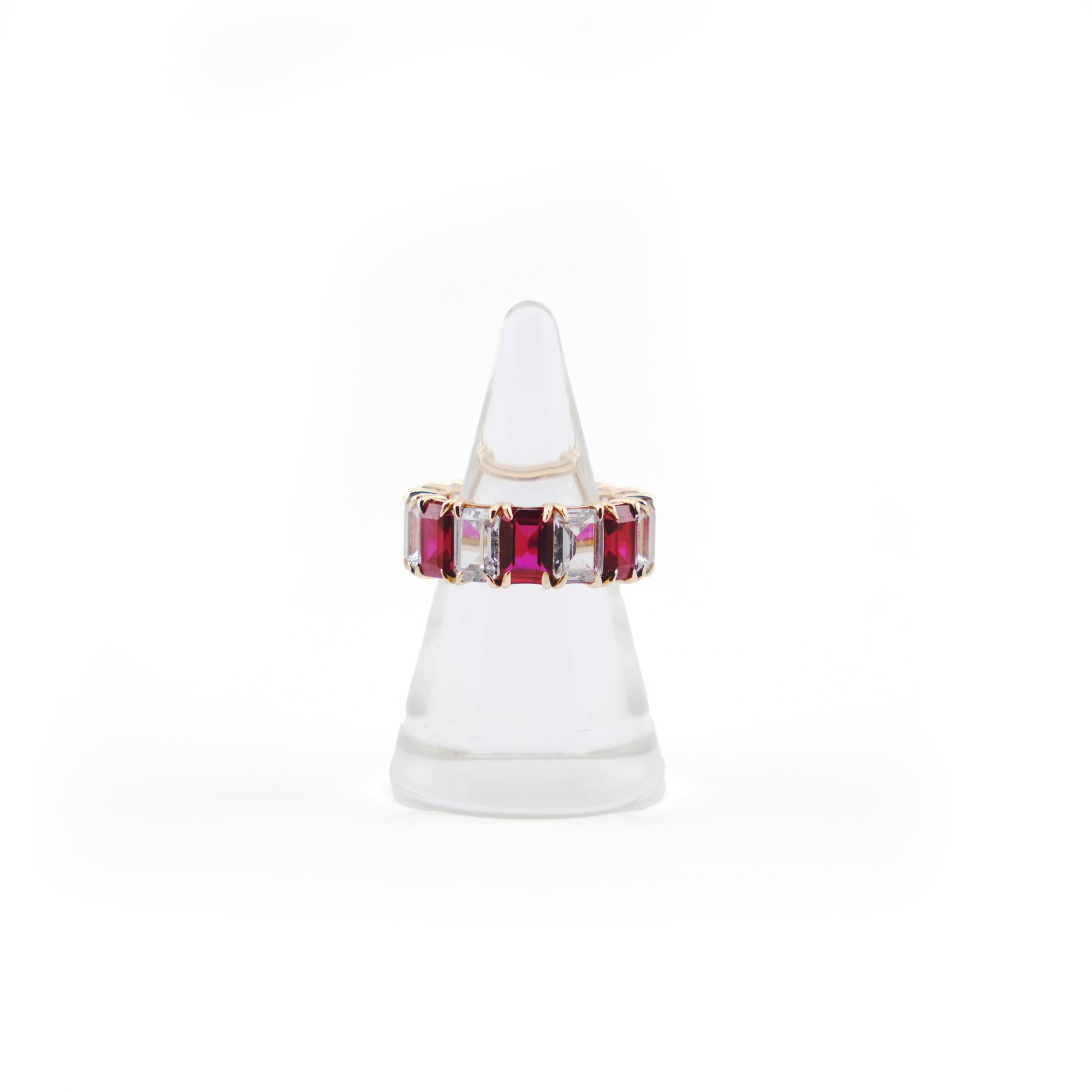 Cette magnifique bague d’éternité présente des rubis et diamants fabriqués en laboratoire disposés de manière alternée le long de l’anneau. La monture en or 14K assure durabilité et élégance, apportant une touche de luxe subtil à ce bijou d’exception.