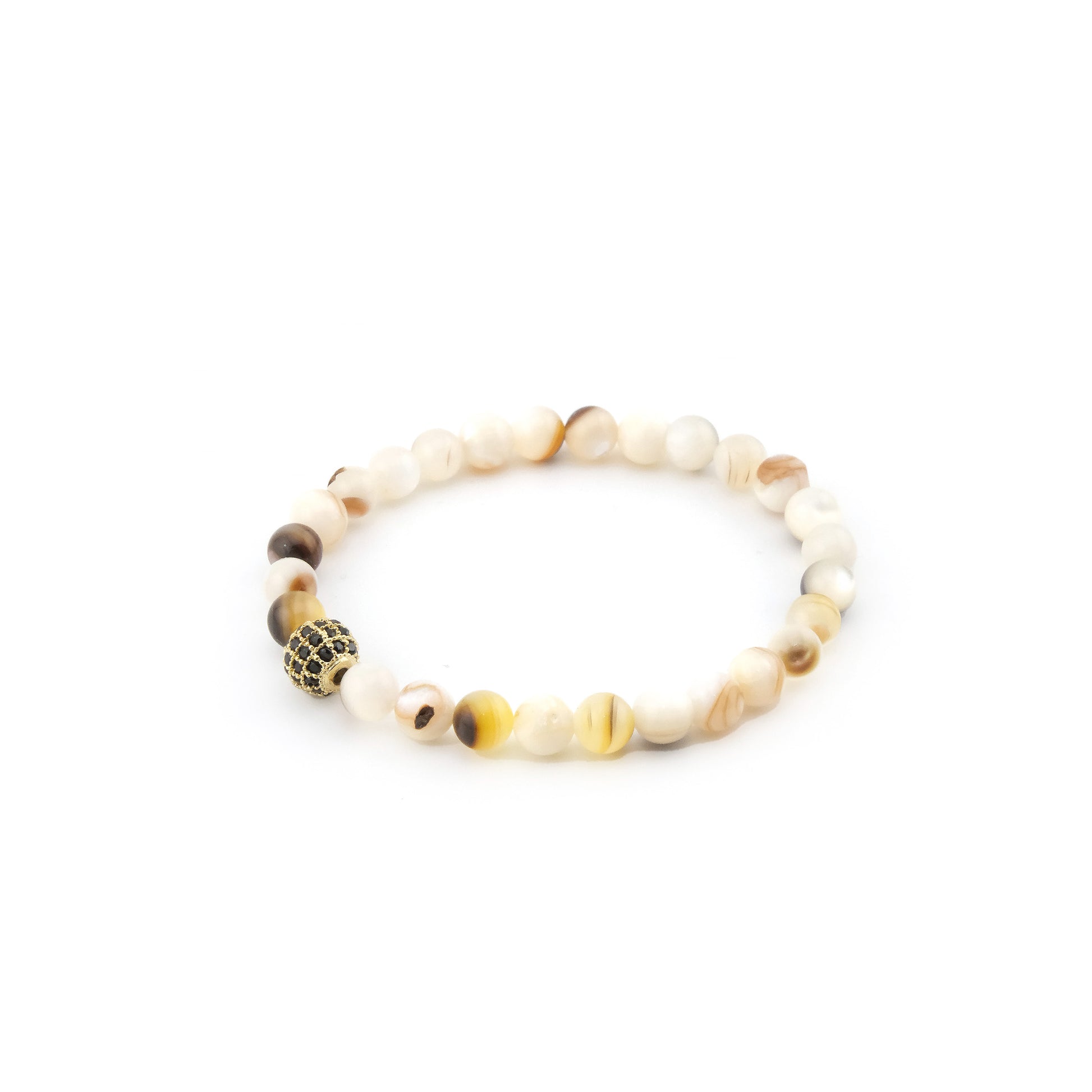 Bracelet en coquille naturelle, composé de perles aux nuances douces allant du blanc nacré au beige doré.