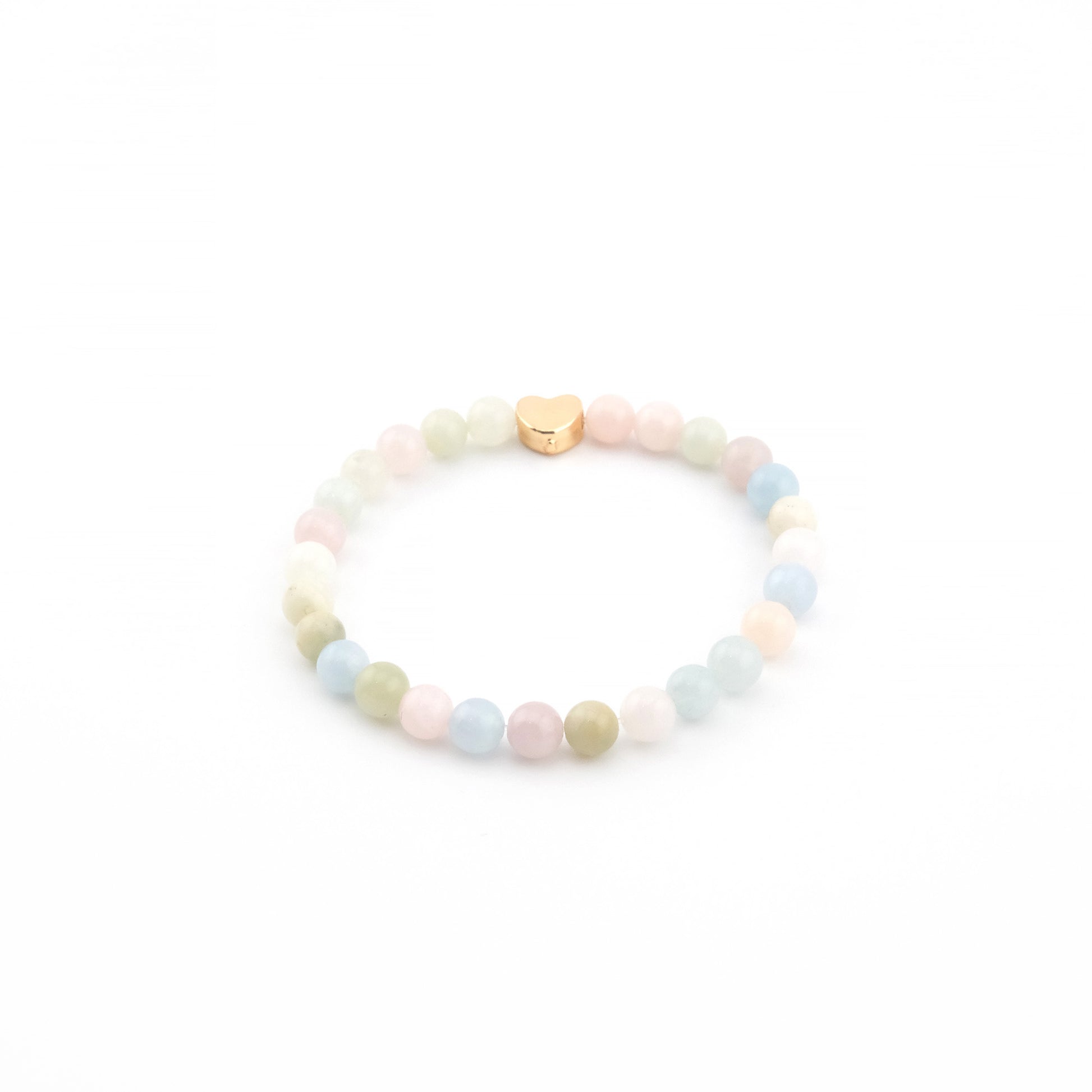 Bracelet en perles de morganite avec un petit cœur doré au centre, monté sur un fil élastique pour un ajustement confortable.