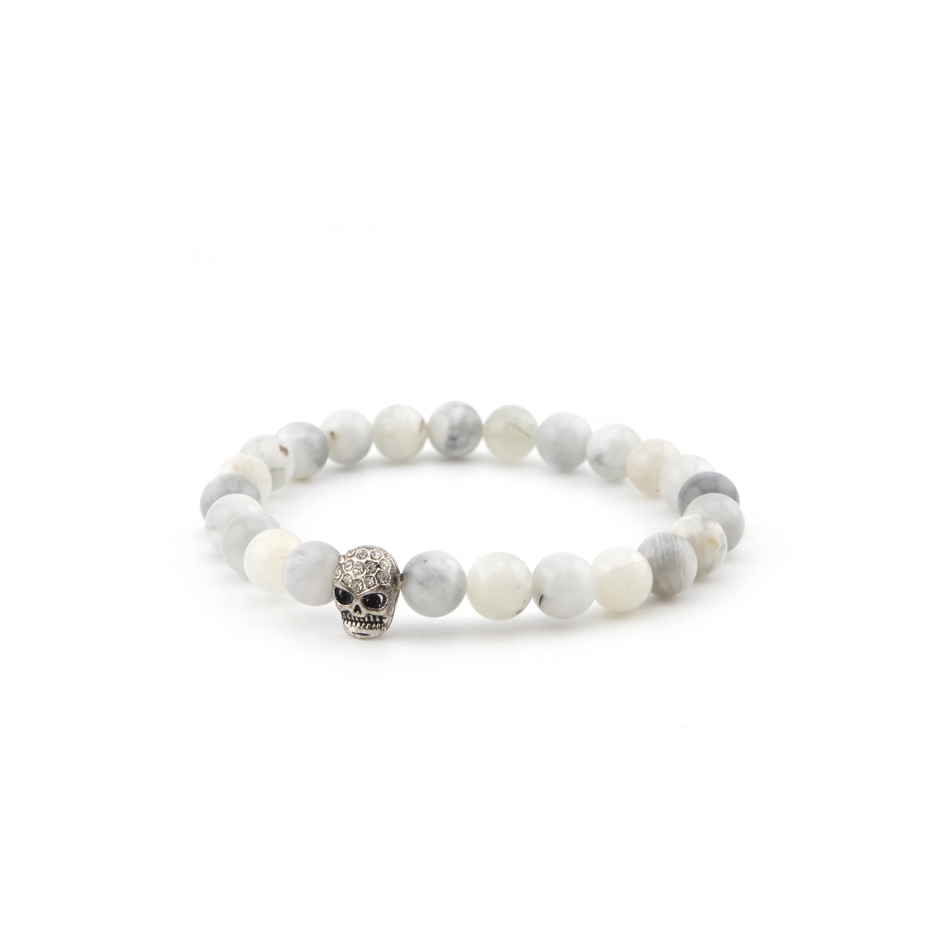 Les perles, aux nuances douces de blanc et de gris clair, s’harmonisent avec une perle centrale en forme de crâne argenté incrusté de détails fins, apportant une touche contemporaine et audacieuse.