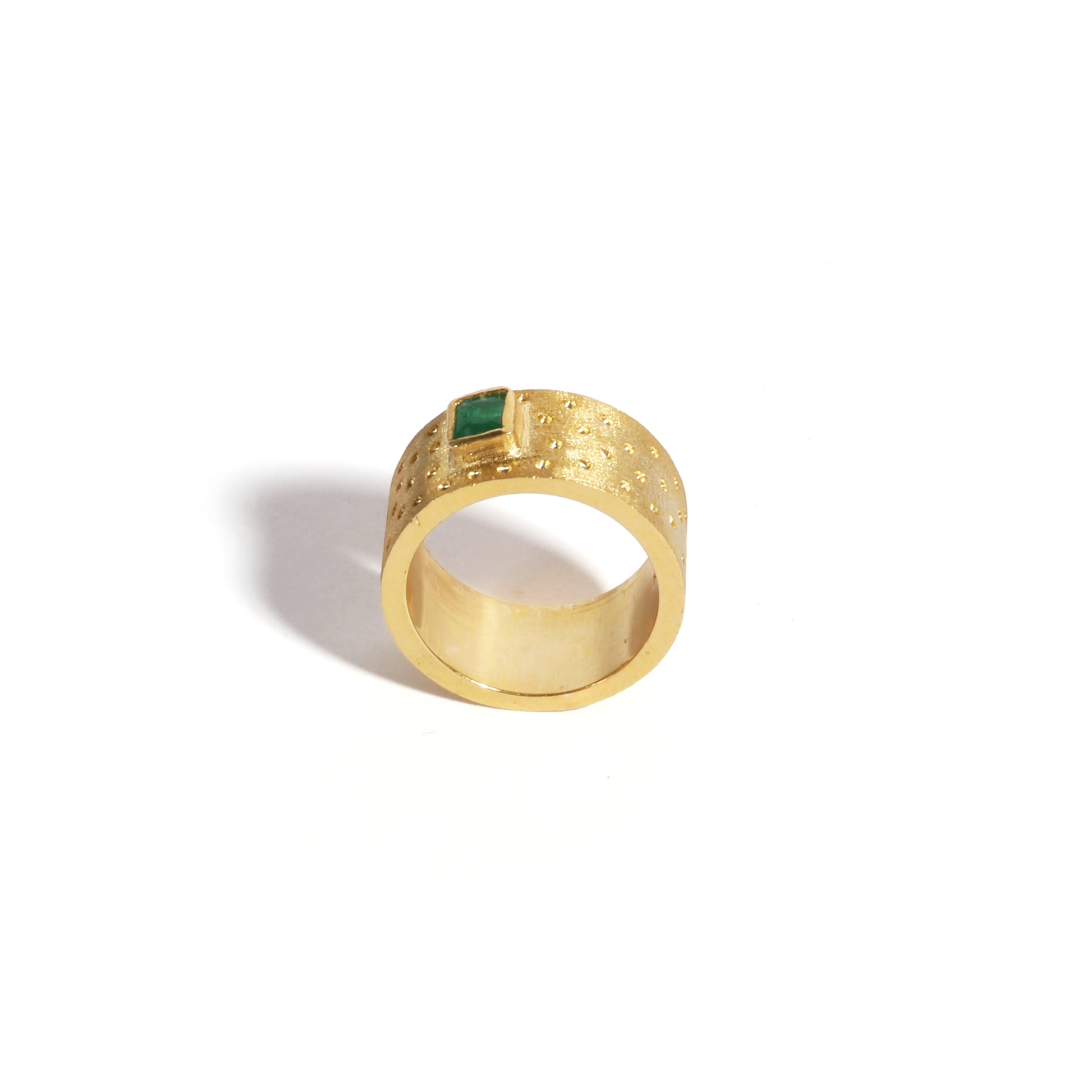 La pierre précieuse est une émeraude. Bague faite main. Argent sterling 925. Plaqué or.