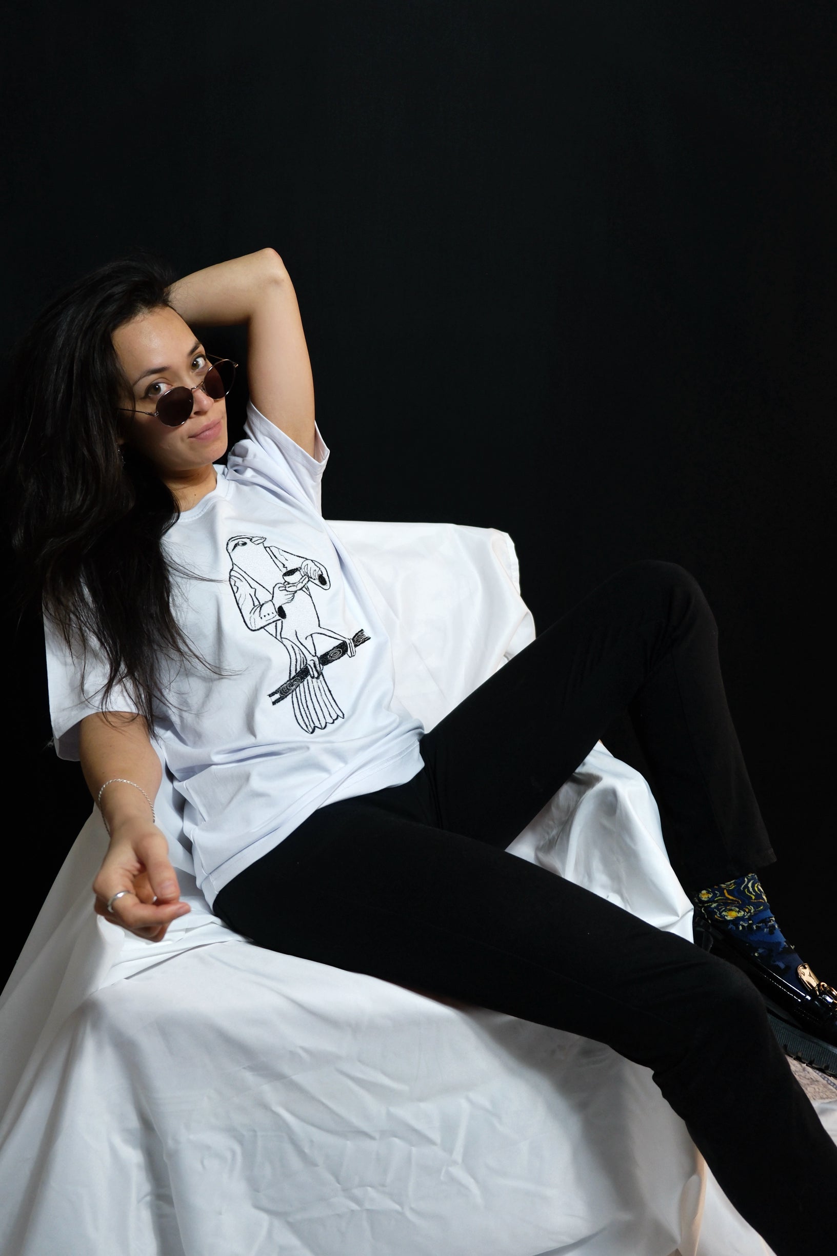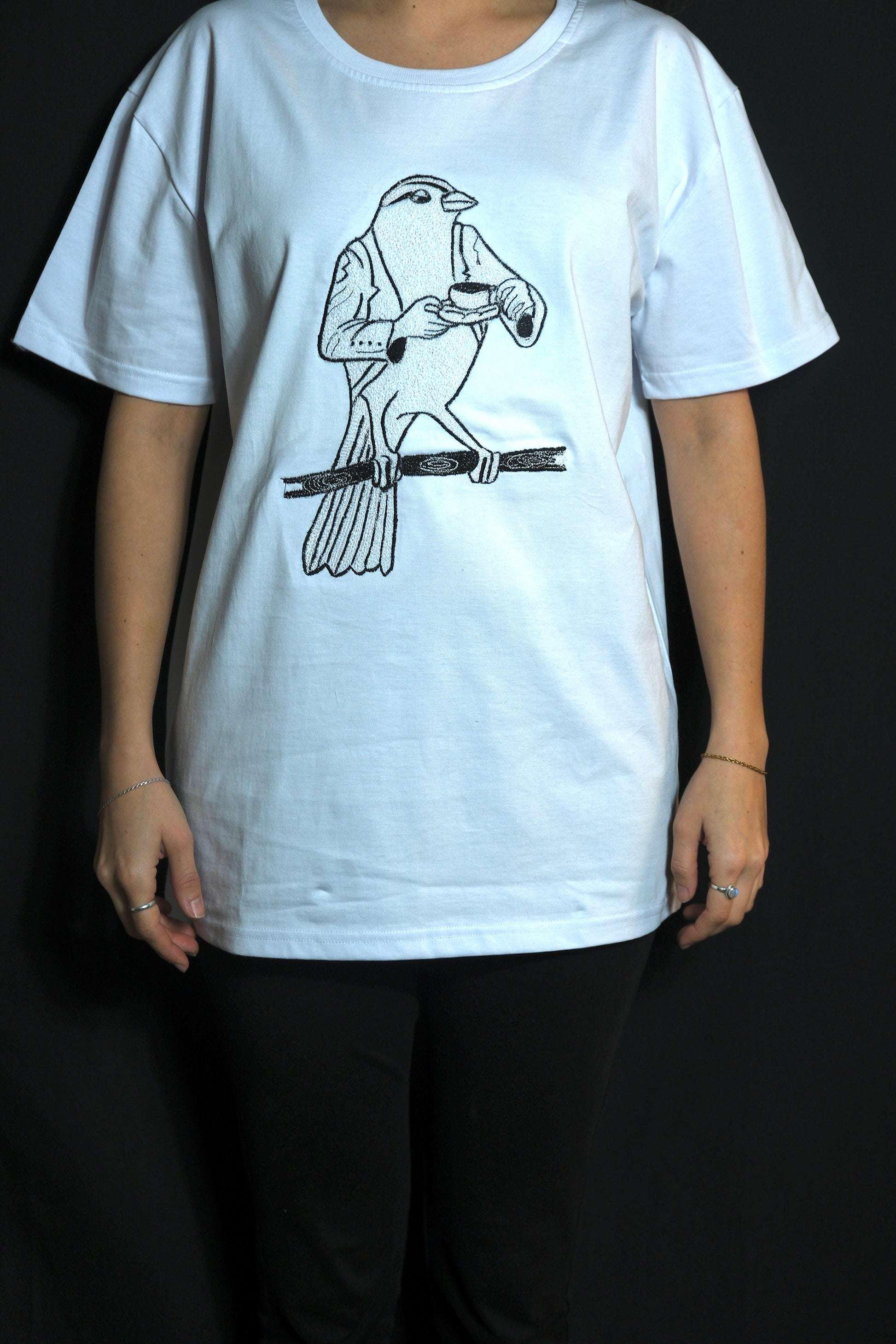 T-shirt graphique unisexe 80 % coton, 20 % polyester avec une version brodée à la main d' Oiseau Grand par Daniella McNulty.