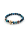 Bracelet en perles d’œil de tigre bleu, rehaussé de 3 perles fantaisies dont une tête de léopard dorée, monté sur un fil élastique pour un ajustement confortable.