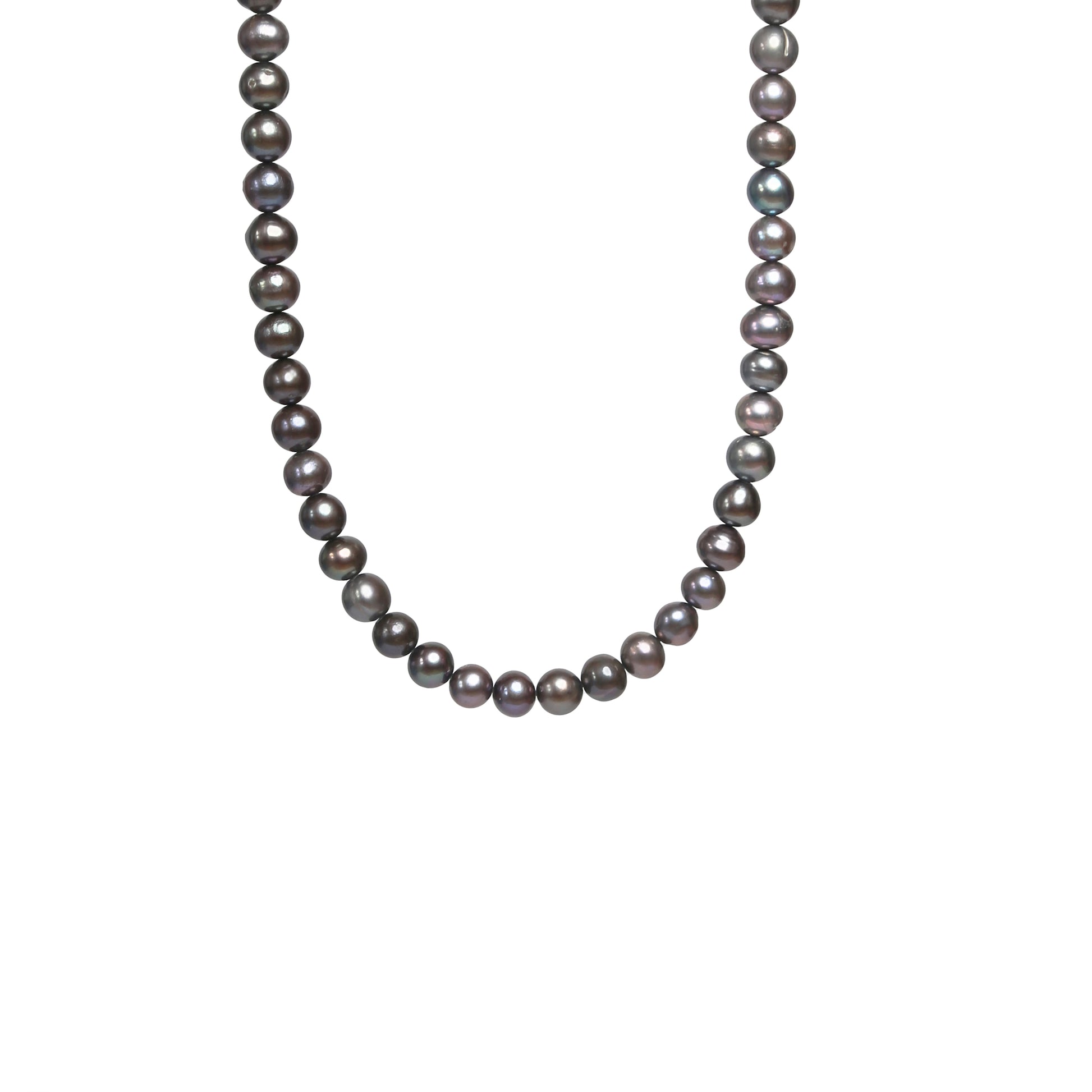 A slight twist on the classic necklace. With a natural dark color, these pearls will adorn your neck very elegantly. Cultured, fresh-water pearl necklace with details in 925 Sterling silver. Model in the first picture is wearing a 40 cm. necklace and model in the last picture is wearing a 45 cm. necklace