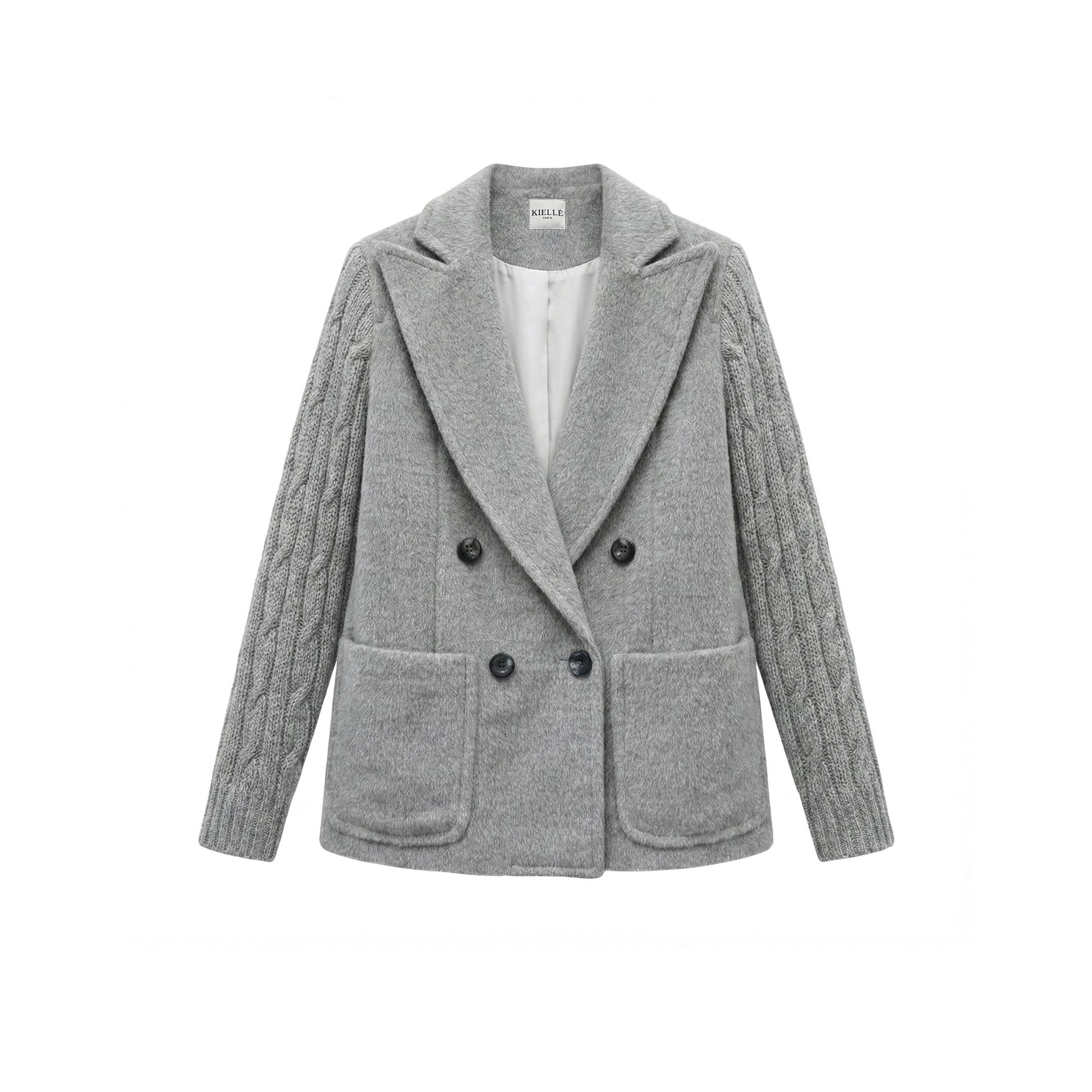 This double-breasted blazer is crafted from premium light gray alpaca wool, featuring tonal cable-knit sleeves for a unique textural contrast. Defined by a structured double-breasted silhouette and wide notched lapels, it balances the sharpness of traditional tailoring with the comfort of fine knitwear.