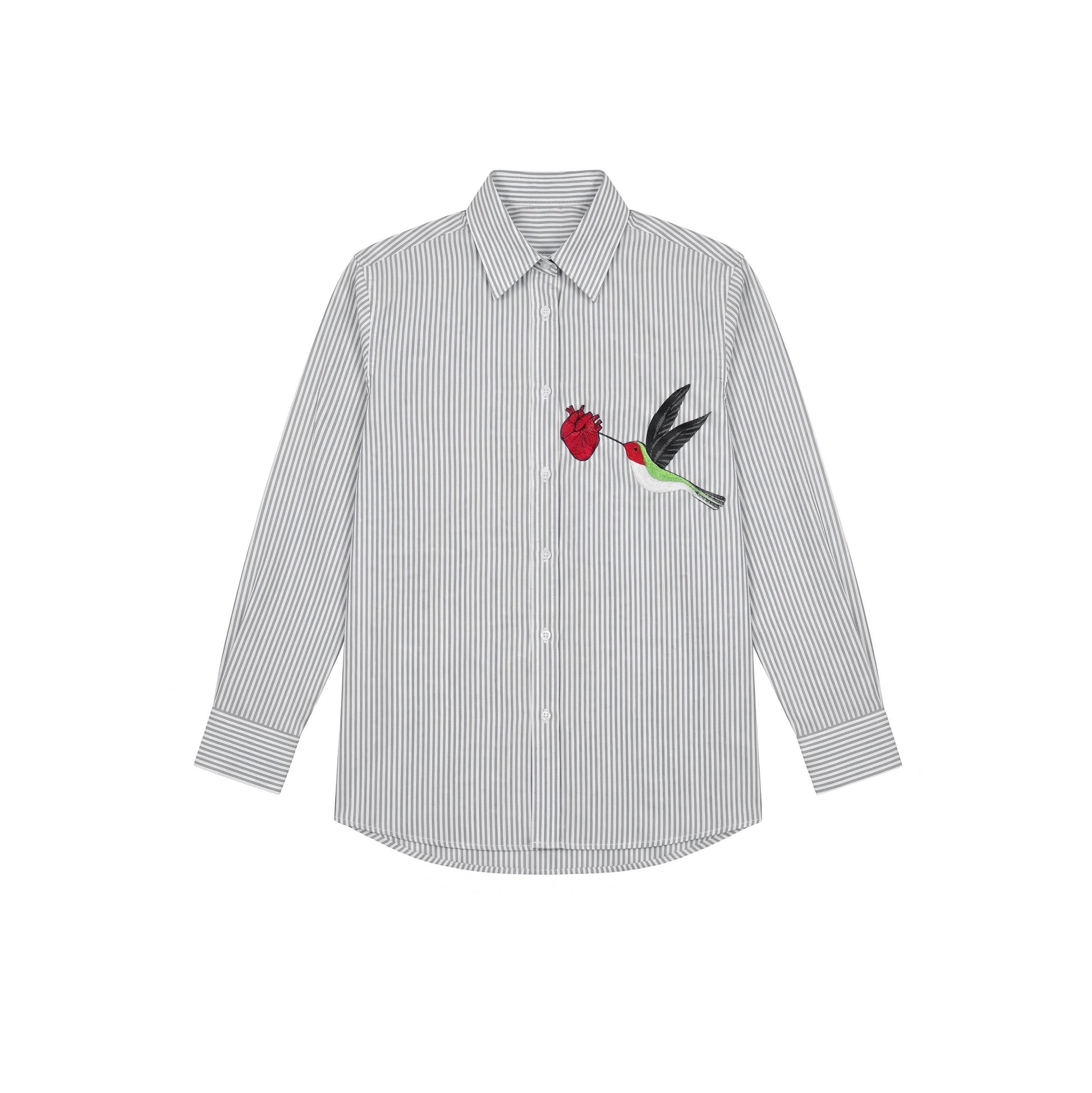 A unisex cotton striped shirt with a hand-embroidered hummingbird and heart motif.