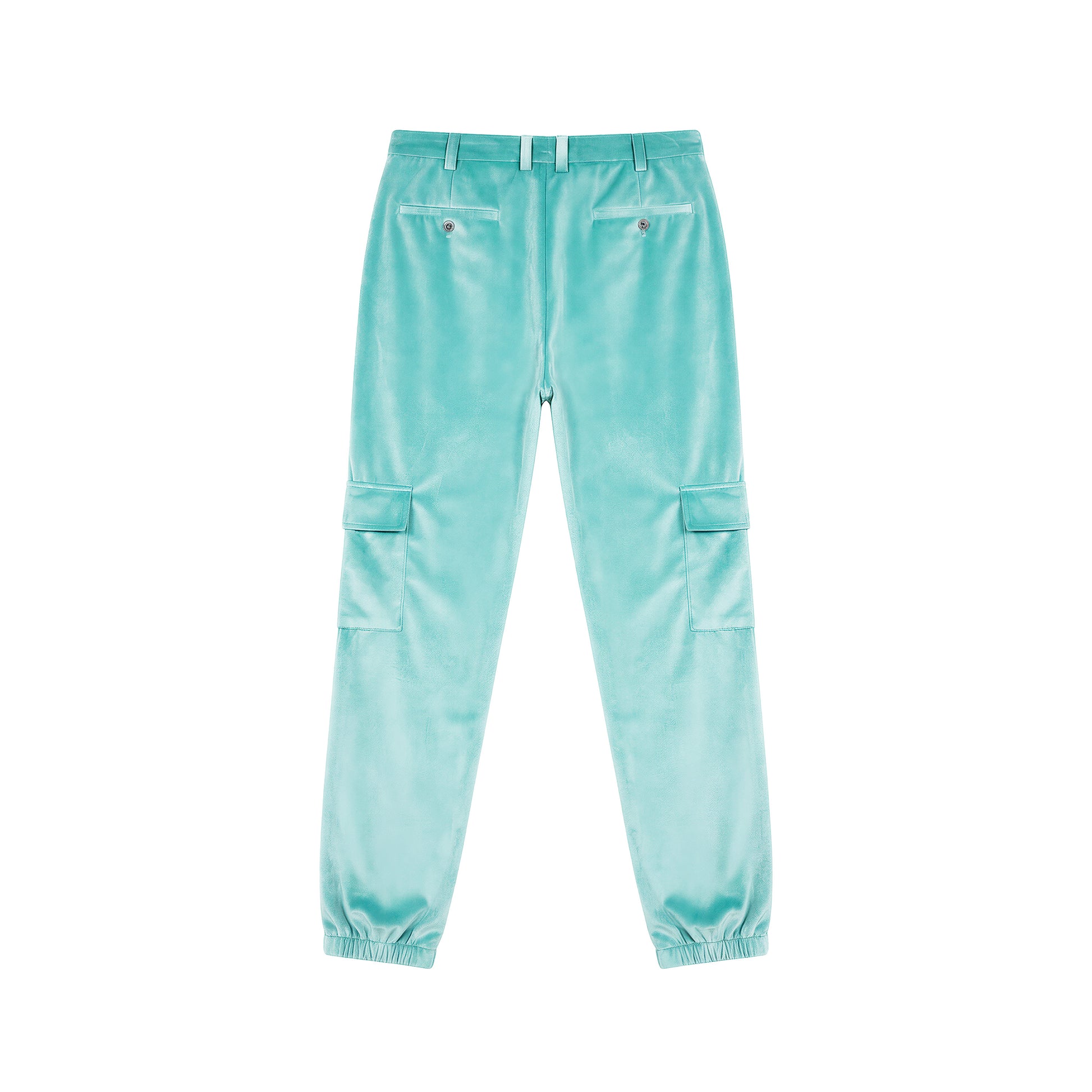 Crafted from plush lake-blue velvet with a smooth, luminous finish, these cargo trousers combine refined texture with a modern street sensibility. Designed with intentional, sculptural pleating, the fabric drapes fluidly along the leg, creating a relaxed yet directional silhouette. Exceptionally soft and silky to the touch, the trousers offer all-day comfort and effortless wear. The elasticated cuffed hems subtly taper the fit, enhancing movement while maintaining a clean, streamlined profile—perfect for both elevated styling and everyday ease.